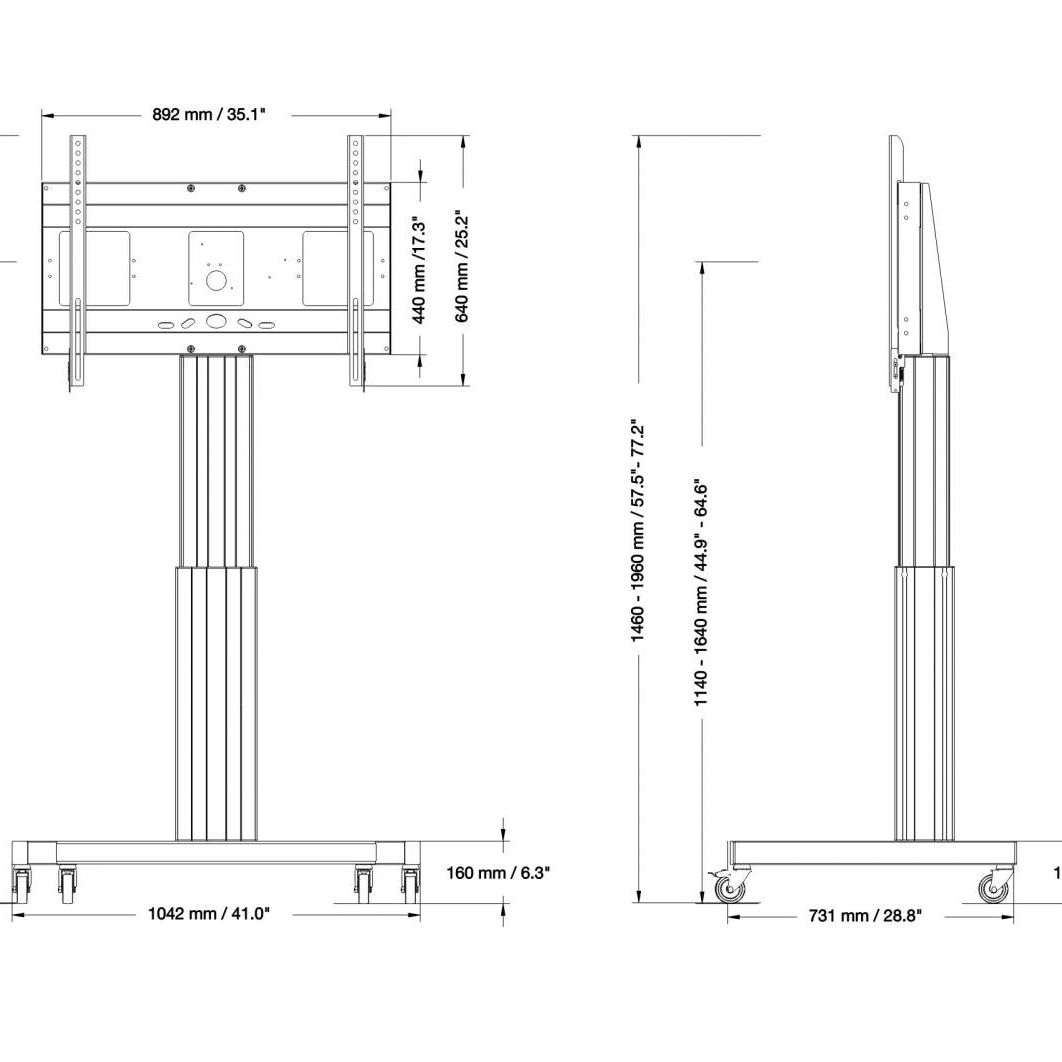 Renowned for its stability and versatility the SCETAV mobile monitor stand has been Conen Mounts worldwide best-selling mobile stand for many years. The mobile stand is designed to withstand intensive daily use and to safely support displays up to 100" or 136 kg. The SCETAV features the standard center column, offering 50 cm of smooth motorized height adjustment.