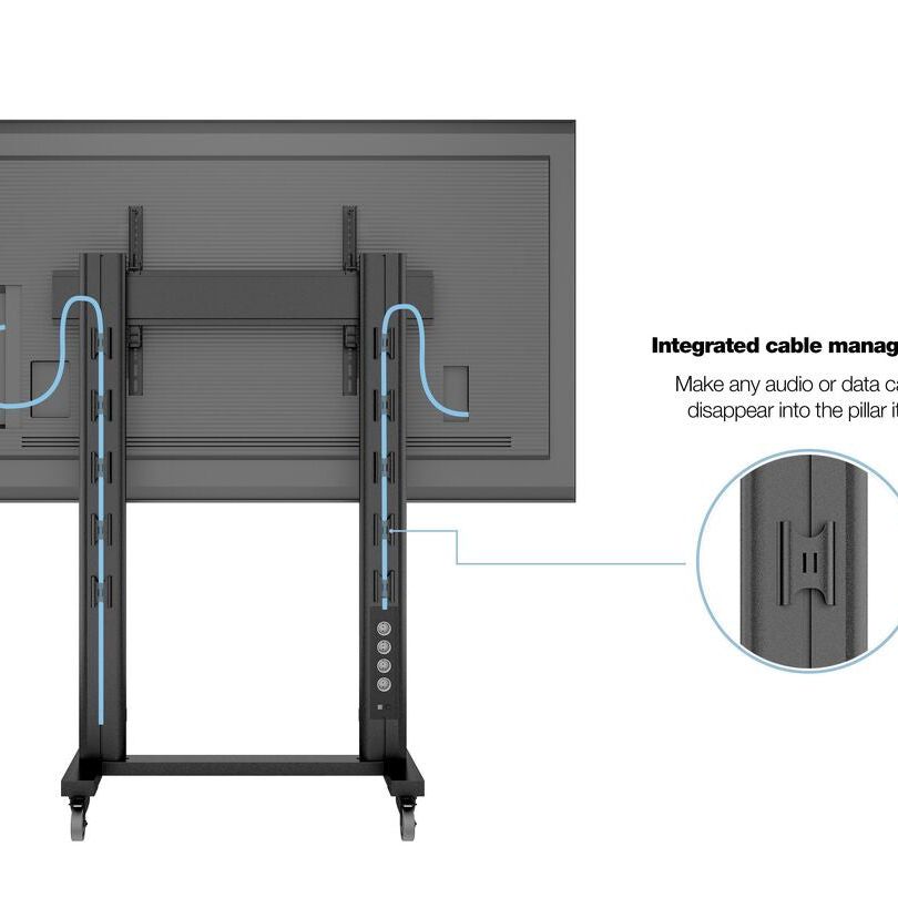 Design from us is often described as being fairly minimalist, with clean simple lines. Highly functional, the style is effective without needing heavy elements; only what is needed is used. Our M Public Display Stand 180Dual Pillar Wheelbase is designed through that philosophy, as an example you will see little or no excessive cables around the floor stand. The pillars has built in cable management, making any audio or data cables disappear into the pillar itself. The included steel floor base has a wide footprint making the unit stay steady on ground, yet thin enough not to be in focus.